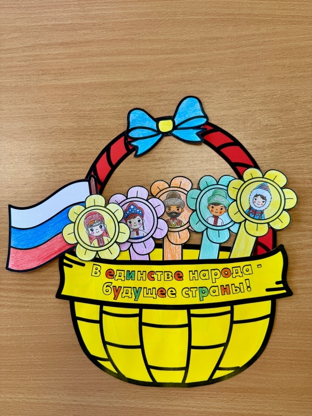 Послушали сказку «Как народы подружились» . Ребята изготовили «Корзинку единства». Корзинка - символ единства и сплоченности. Народы России, несмотря на различия в культуре, языке и традициях, объединяются в одно целое, создавая сильное и многонациональное государство.